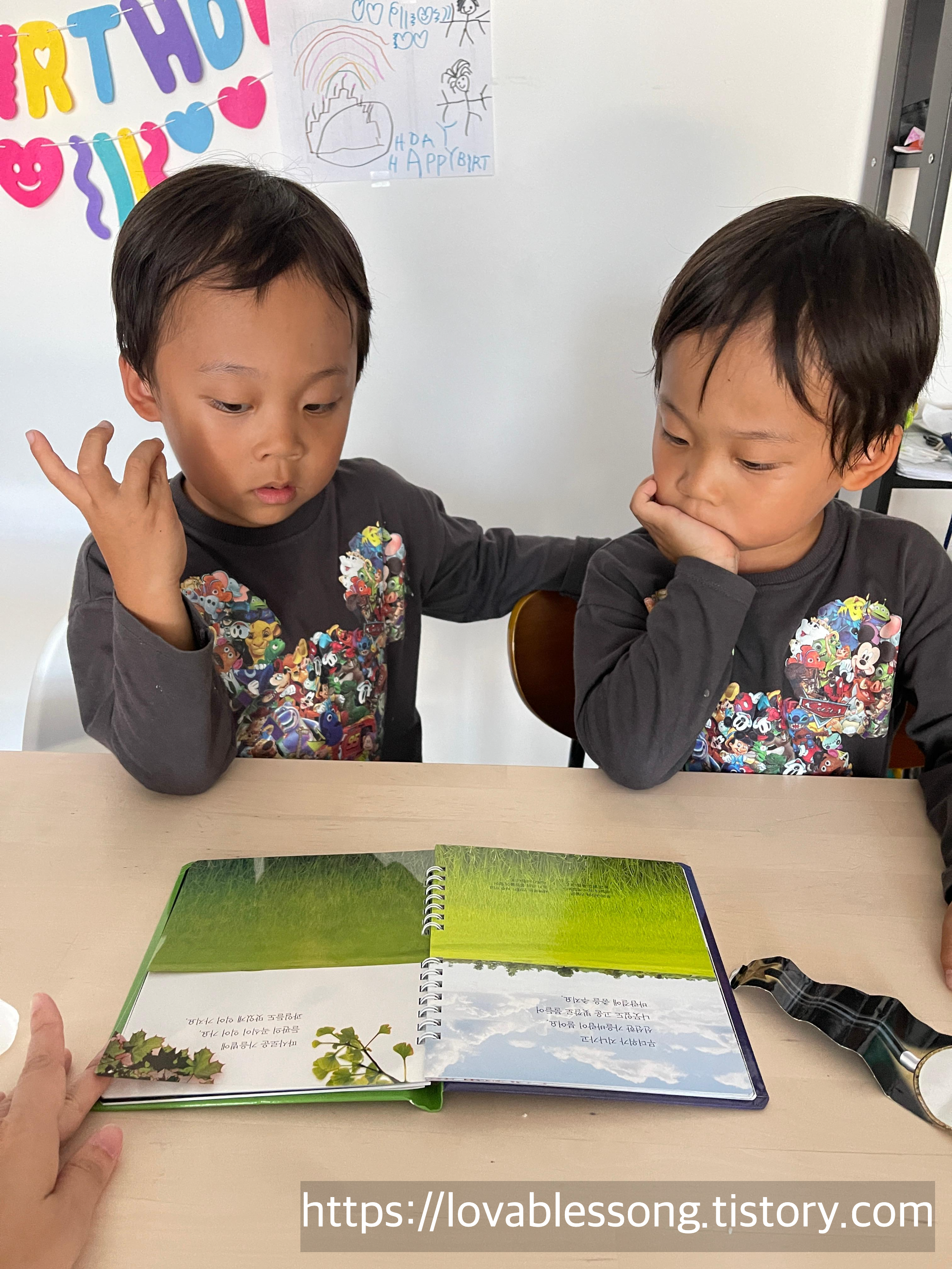 마이퍼스트월드 책은 얇지만 해줄 이야기가 너무 많아서 둥이들은 항상 경청. 사진 속에서 책을 안보고 다른 곳을 볼때는 책에 집중 못하는 것이 아니라 생각이 많아져서 궁금한거 그리고 이야기 하고 싶은거 생각하느라 눈이 바쁘다.