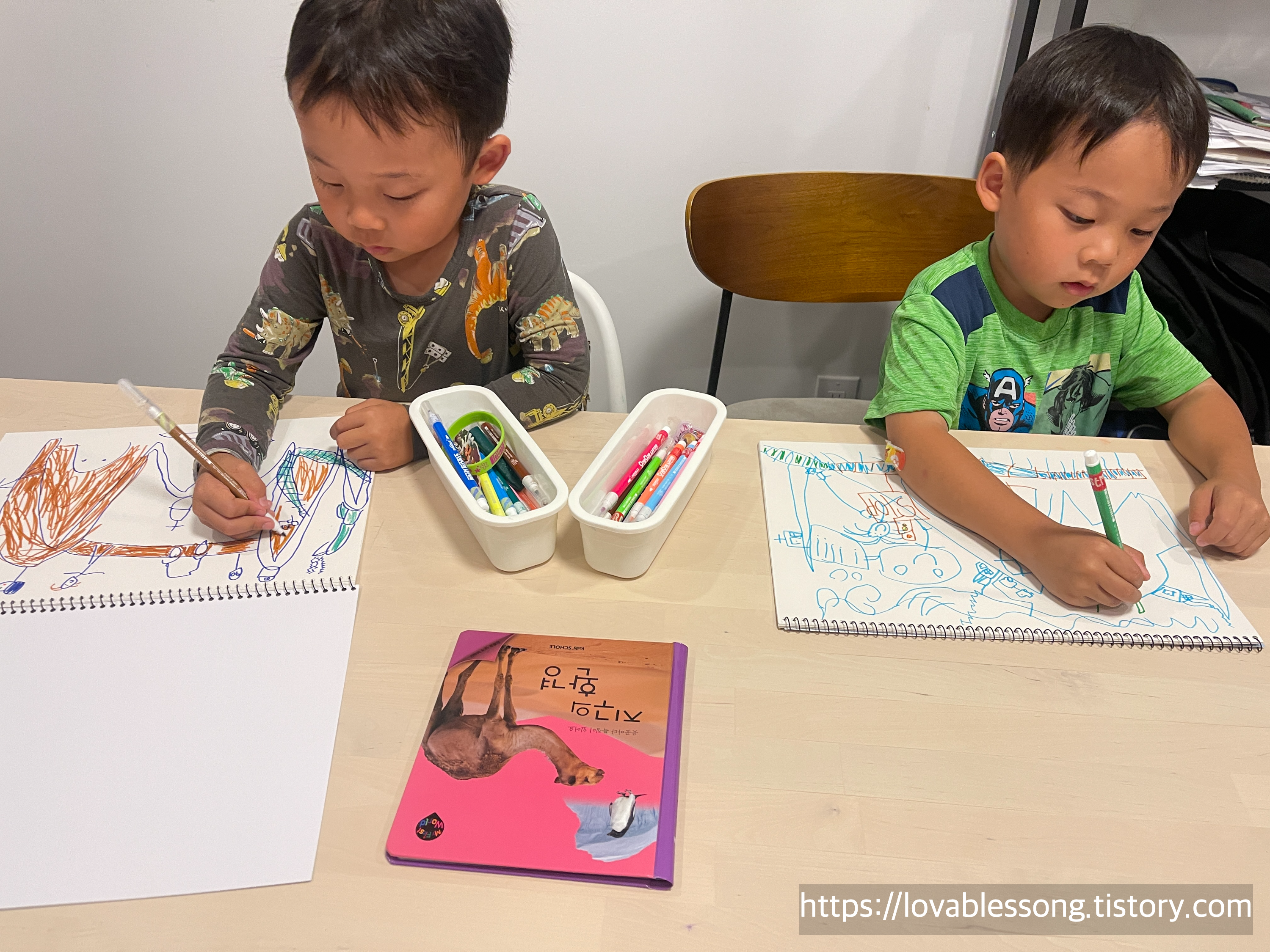 아이들의 그림이야기를 듣다보면 너무 재미있다. 그림을 그릴때 그리고 싶은 대상을 그냥 담는것이 아니라 항상 스토리가 있다. 그림 속에 등장하는 인물은 누구이며, 어떤 사건이 있고, 어떤 건물들이 있는지 아이들의 머릿 속에 떠도는 재밌는 이야기들을 그림 속에 담는다. 그림속에는 둥이들과 엄마가 있었고, 책에서 본 동물들이 있었고, 둥이들이 좋아하는 집과 학교가 있었다. 담은 소재는 비슷하지만 내용은 전혀 다른 둥이들의 그림.