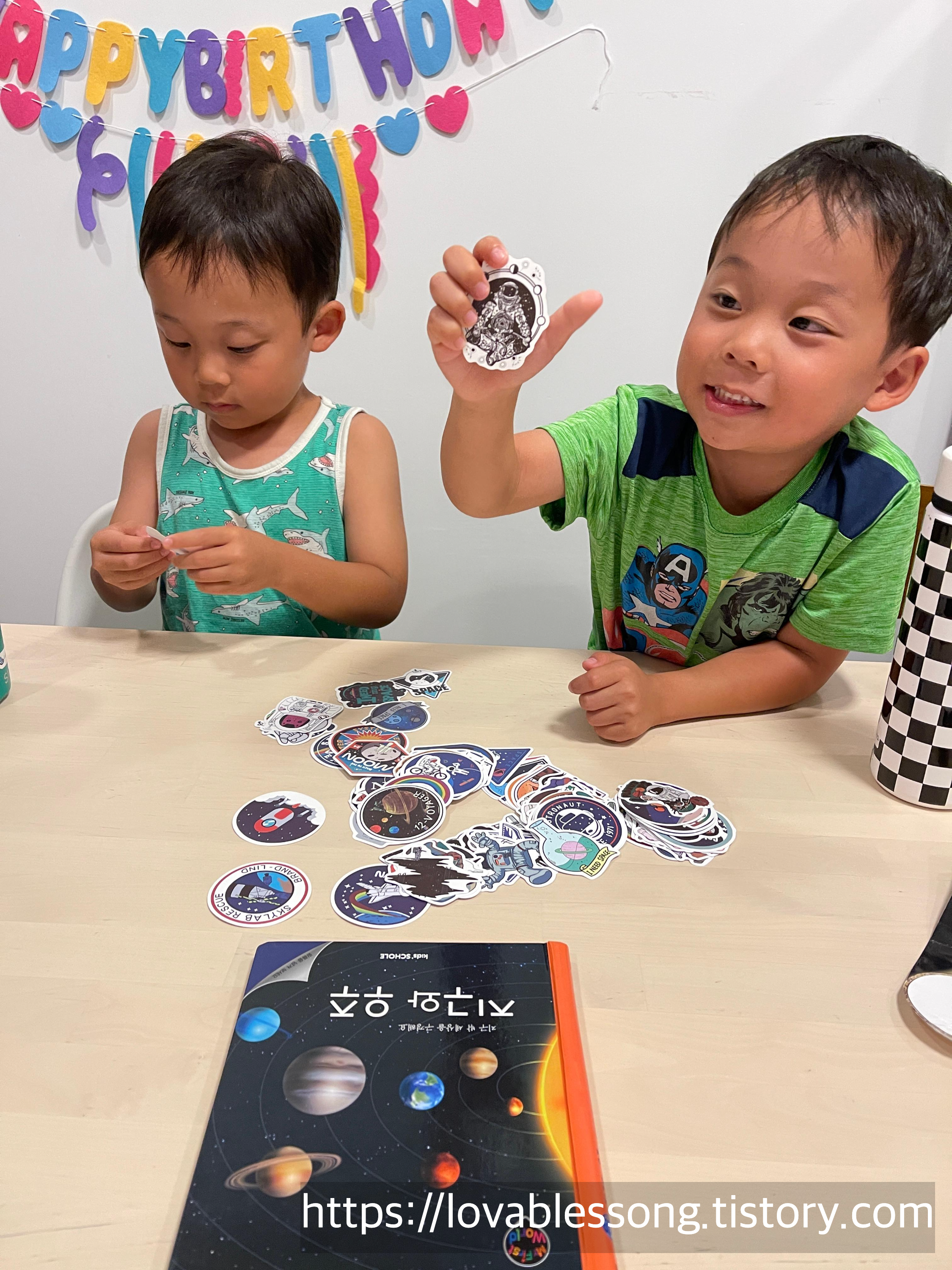이제 독후활동 시작. 독후활동 할겸 새로산 텀블러를 같이 꾸며볼겸 구입한 우주스티커. 아이들과 우주스티커를 보면서 우리가 나눴던 이야기를 다시 한번 상기해보고, 아이들이 고른 스티커가 왜 좋은지도 말해보았다. 그리고 고른 스티커로 텀블러 꾸미기까지 완성.