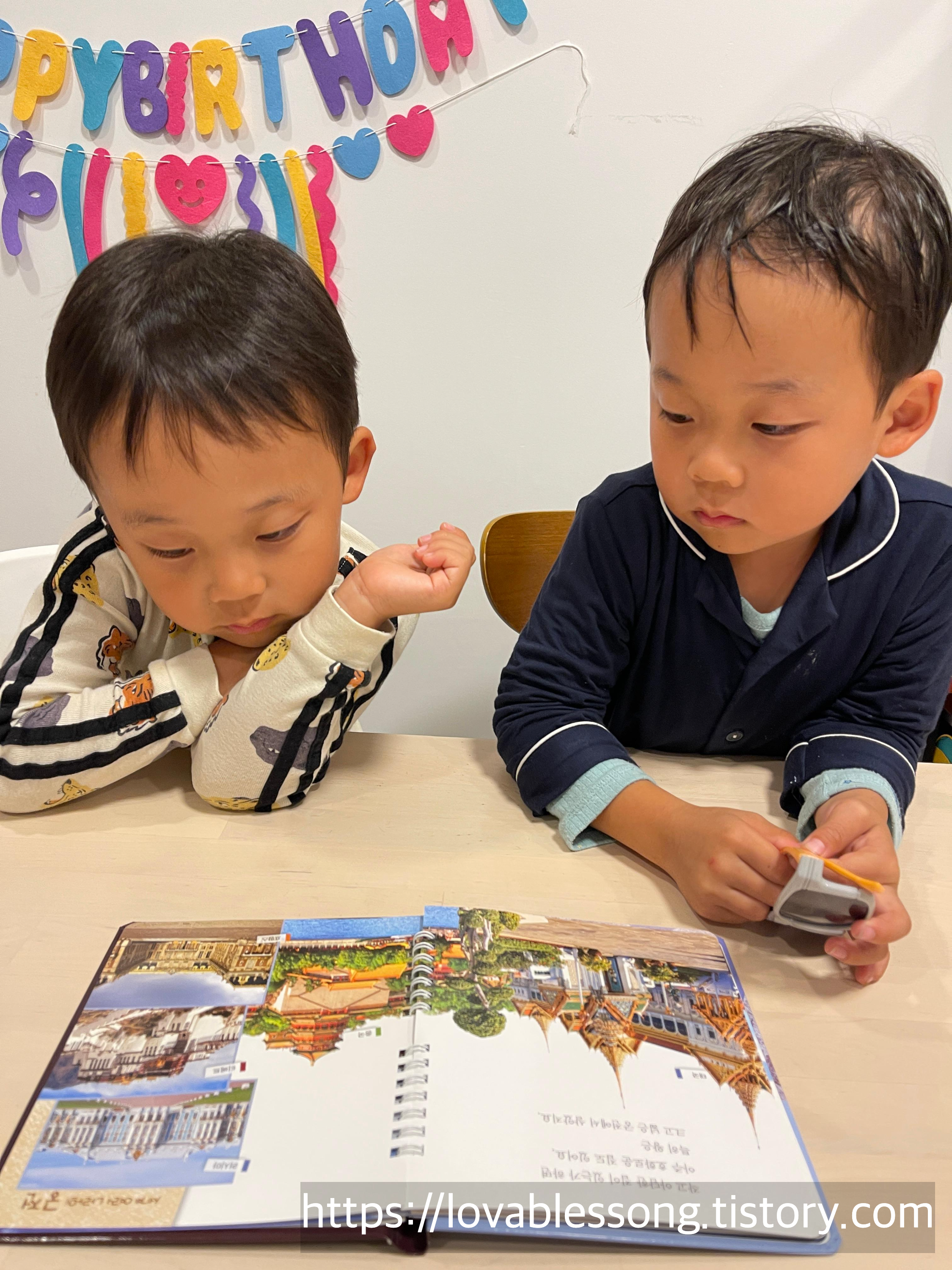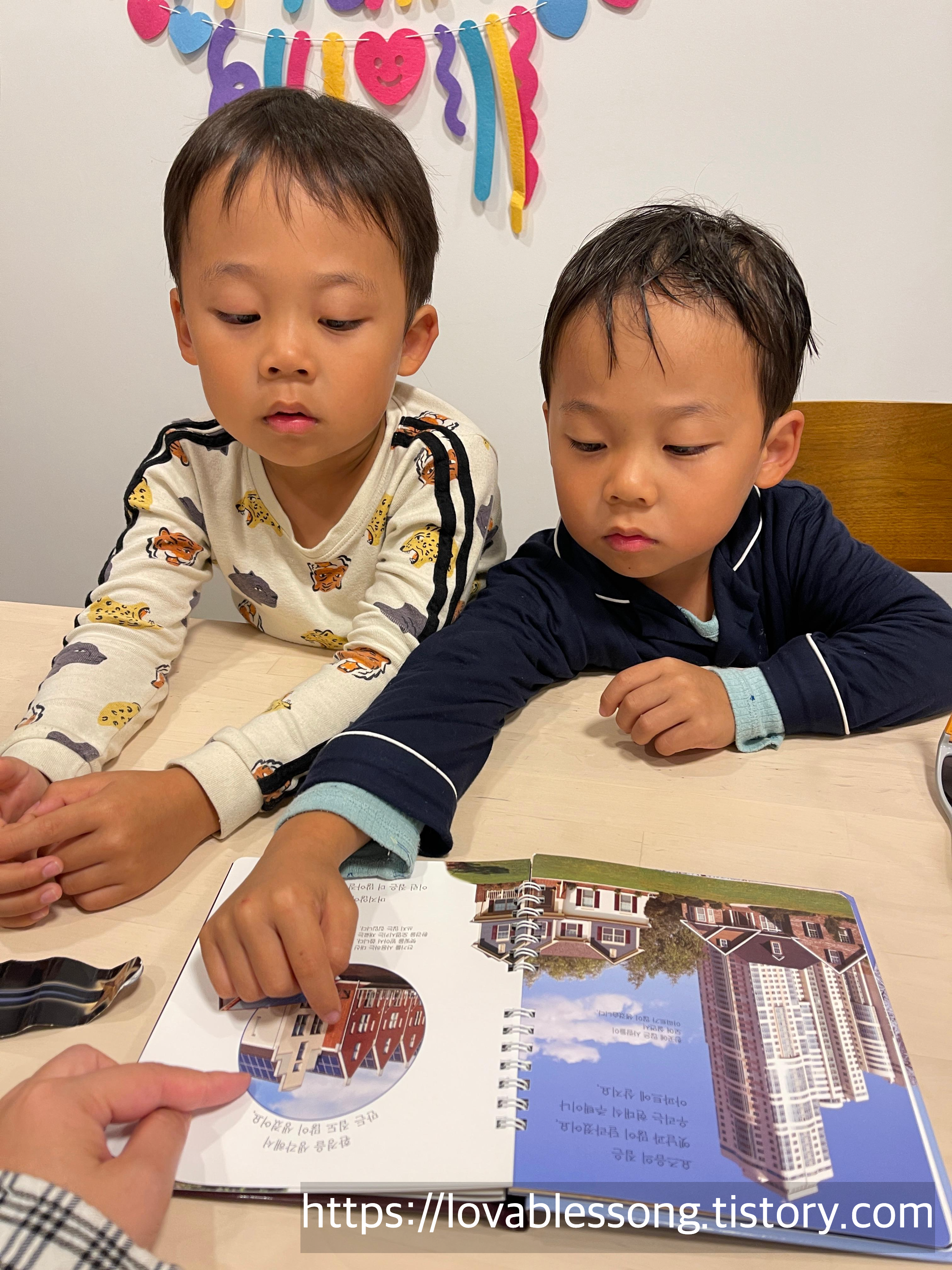 또 현대식 건물은 어떻게 변화되어왔는지, 어떻게 환경을 생각하게 되는지에 대해서도 알수 있는 시간이었다. 각 나라별 독특한 건축양식을 본 둥이들은 각자가 갖고 싶은 것을 고르며 책읽는 시간이 더욱 다채로워졌다.
