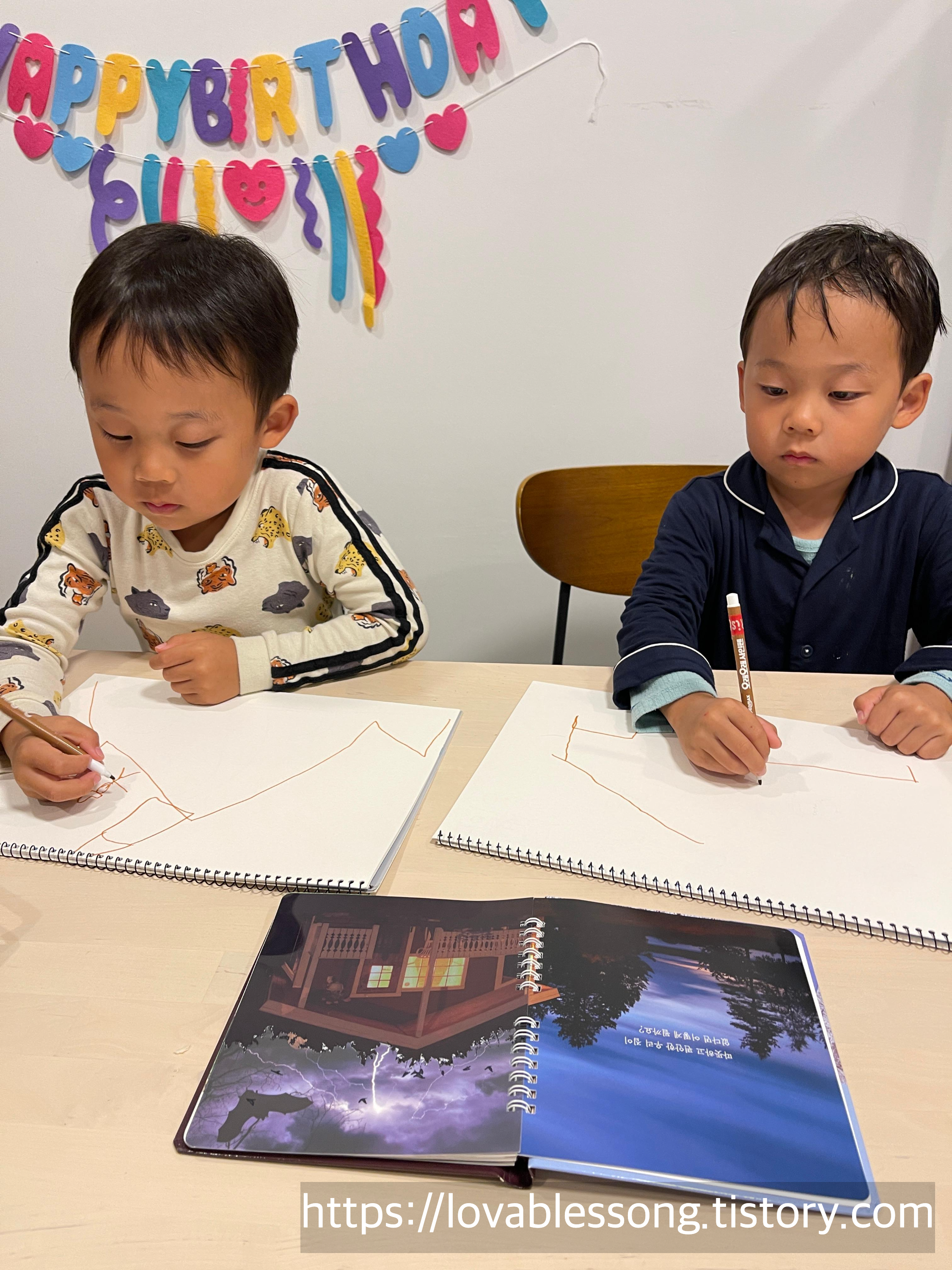 이제는 신나는 독후활동 시간. 아이들에게 너네가 원하는 집을 그림으로 그려보자고 제안했다. 루크는 어떤 집을 원하는지 아는듯 과감하게 그려나가기 시작했고, 리암이는 번개치는 장면 속 집이 마음에 들었는지 그것을 보고 집을 그리기 시작했다.