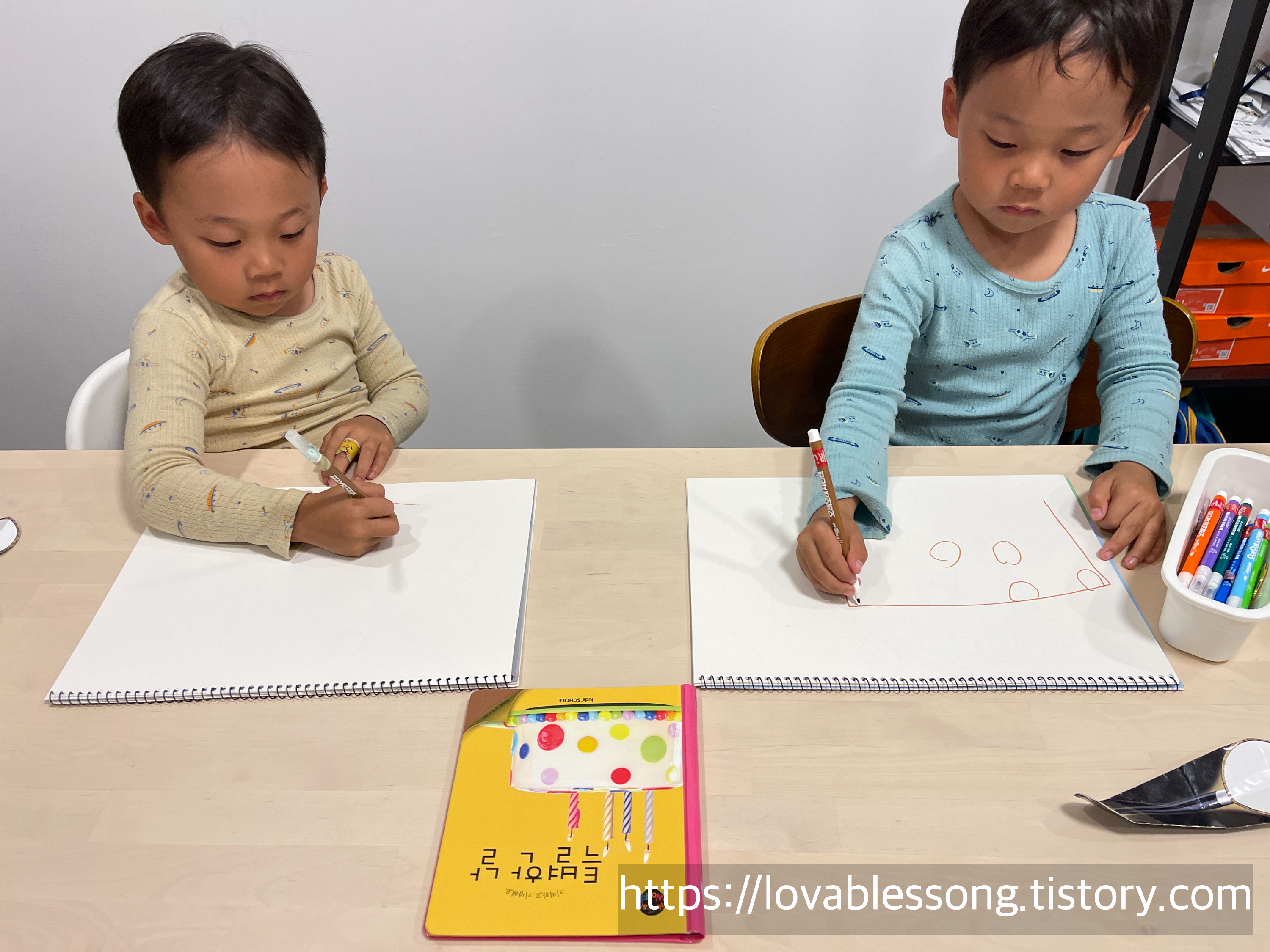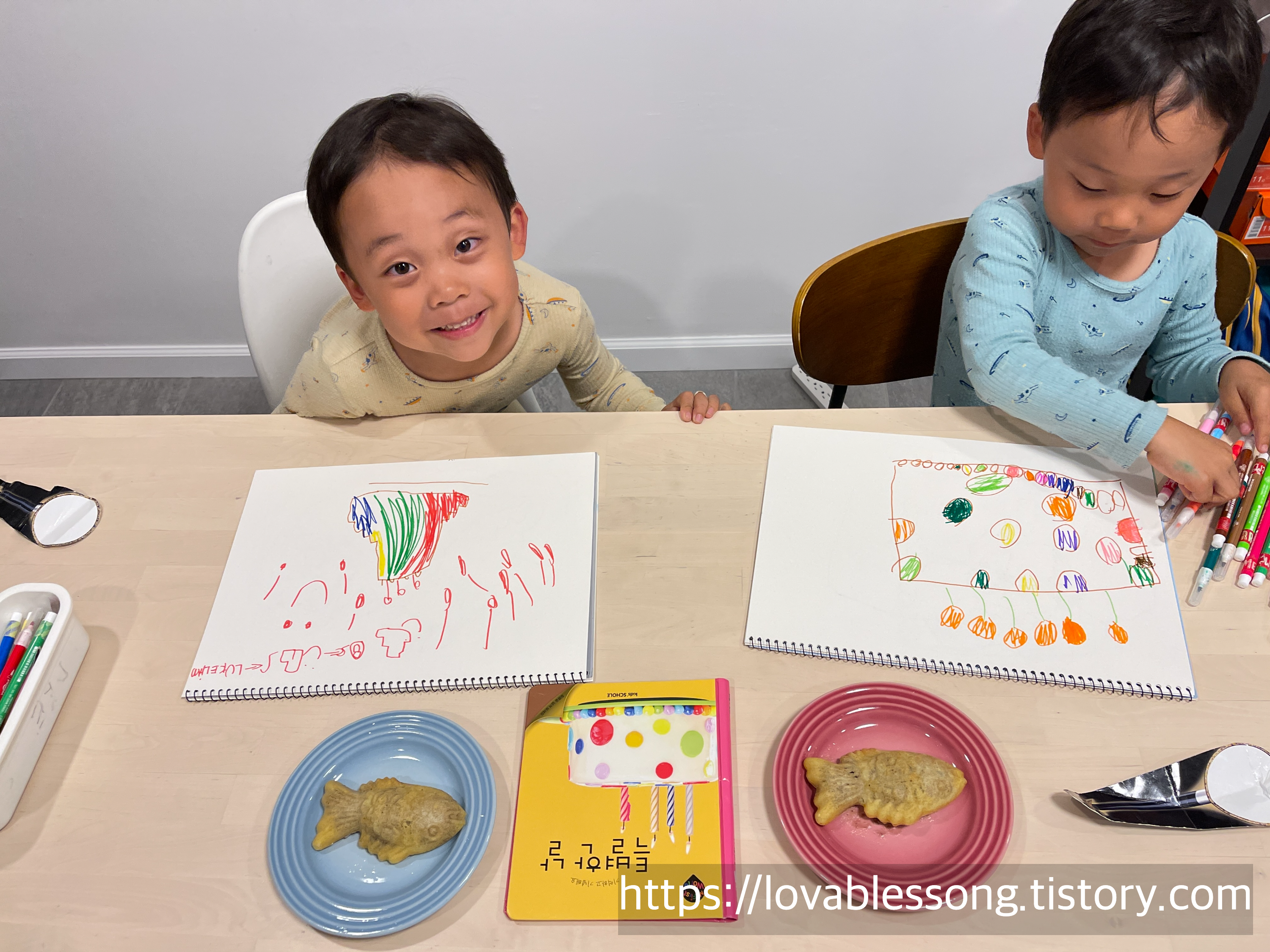오늘 함께 읽은 <특별한 날>인 만큼 아이들과 각자 생일에 받고 싶은 케이크를 그려보기로 했다. 아이들에게 정성껏 정말로 받고 싶은 케이크를 그려야 6살 생일에 그 케이크를 받을수 있다고 이야기했다! 그랬더니 정말로 정성껏 그리며, 자기가 받고 싶은 케이크에 대해 설명한 둥이들.