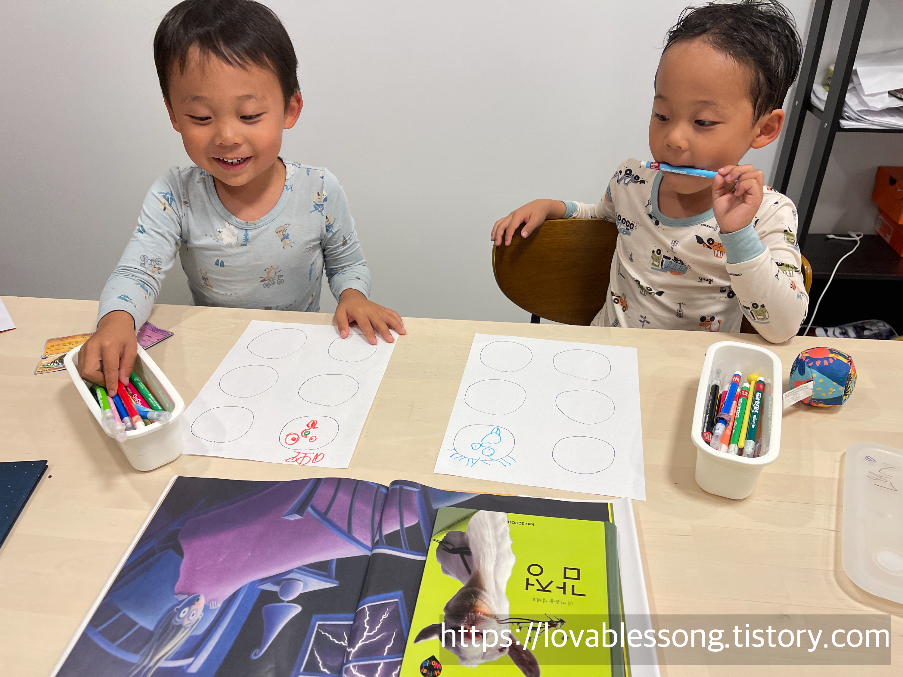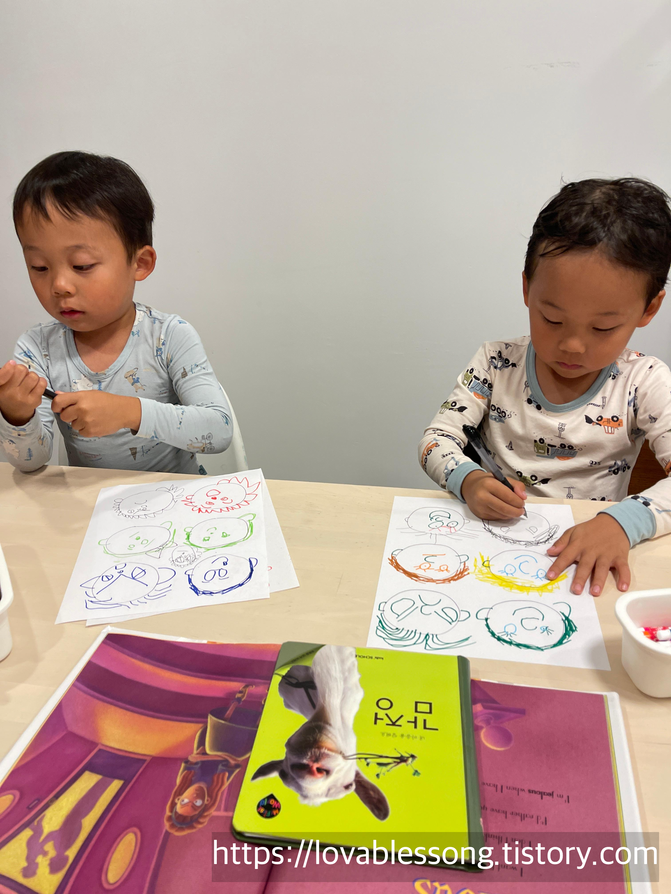 독후활동은 책에서 본 다양한 감정들의 얼굴을 그려보는 걸로 진행했다. 아이들이 너무 신나했다. 웃긴표정, 화난표정, 슬픈표정, 부끄러운 표정 등등 책에서 본 얼굴 표정은 다 그린 둥이들. 깜빡했다면서 귀도 다시 그려넣고, 눈썹도 그려넣는 디테일이 사랑스러웠다.